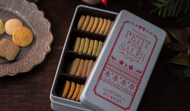 鎌倉レ・ザンジュ(本店:神奈川県鎌倉市 代表取締役社長:株式会社ありあけ 堀越隆宏)は、クリスマス期間限定販売の『プティ・フール・サレ ノエル』を 2023年11月1日(水)よりレ・ザンジュ直営店、ありあけ直営店レ・ザンジュ製品取り扱い店舗、オンラインショップにて販売を開始いたします。 本商品は、「かまくら推奨品」にも選ばれている鎌倉レ・ザンジュで一番人気のクッキー缶「プティ・フール・サレ」のクリスマス限定バージョンです。サンタクロースの故郷とされる北欧の伝統デザイン「ノルディック柄」の缶に、フランス産ゲランド塩を使用した 4 種類のクッキーを詰め合わせました。それぞれのクッキーは、塩と砂糖のバランスに気を使った上品な味わいと、ハーブやトマト、チーズなどの素材がソフトな食感とマッチして後を引きます。クリスマスのディナーの後に、ワインなどのお酒とスイーツのペアリングという大人の楽しみ方もおすすめです。カマンベールとパンデピスは『プティ・フール・サレ ノエル』限定で新登場の味わいです。