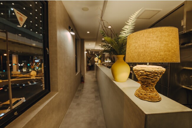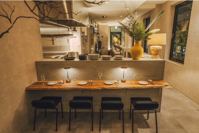 ポップカラーのインテリア、「樹齢100年超えの桜」の大木を利用して制作したテーブル、コンクリートのカウンターなどアートな空間の店内で梅田の夜景を見渡しながらお食事を楽しむことが出来ます。