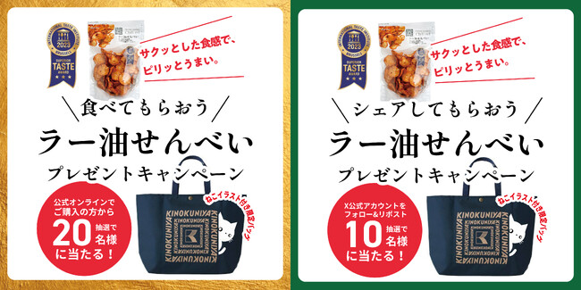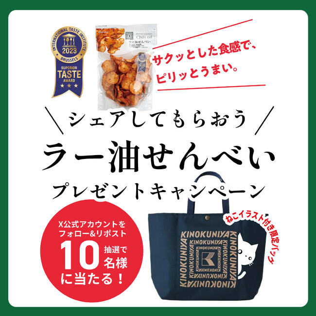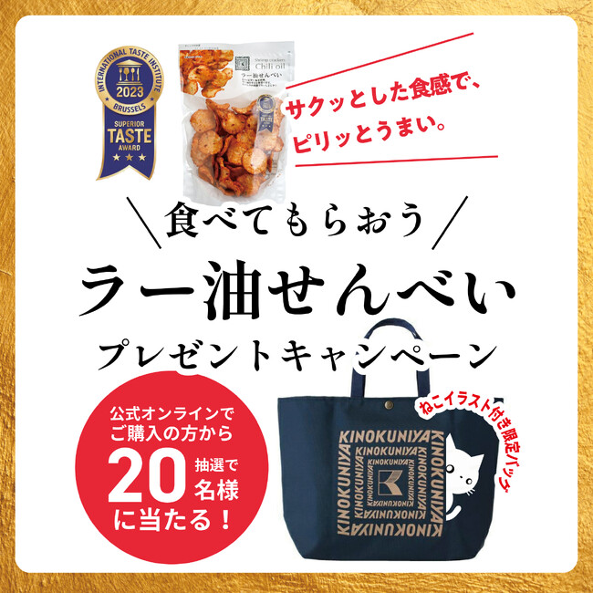 株式会社紀ノ國屋は、5年連続菓子部門売上第一位の「ラー油せんべい(shrimp cracker chili oil)」がInternational Taste Institute (国際味覚機構)の品評会で三つ星★★★を獲得したことを記念して、11月15日 (水) まで、公式オンラインストアと公式X(Twitter)で「ねこのイラスト付き限定エコバッグプレゼントキャンペーン」を開催中です。