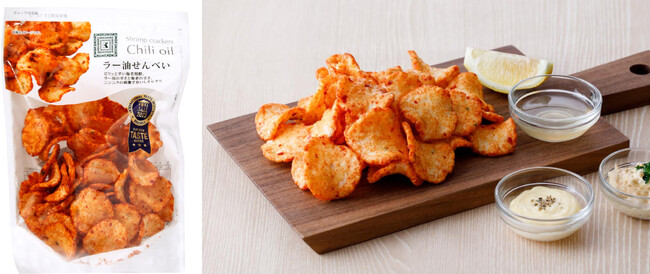 商品特長:ちょっと甘めのえびせんにラー油の辛さと海老の甘さが程良く融合した甘辛な味わいがやみつきになるスナック菓子です。