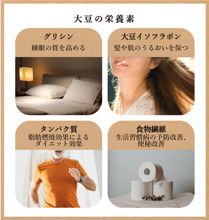 神奈川県南足柄産の大豆を使用し、ノンカフェインでありながら、大豆に含まれる大豆イソフラボンやタンパク質、食物繊維などの体に必要な栄養素を補給できる健康的な飲み物です。さらに、栄養素「グリシン」を含んでいることで睡眠の質を高める効果も期待されています。
