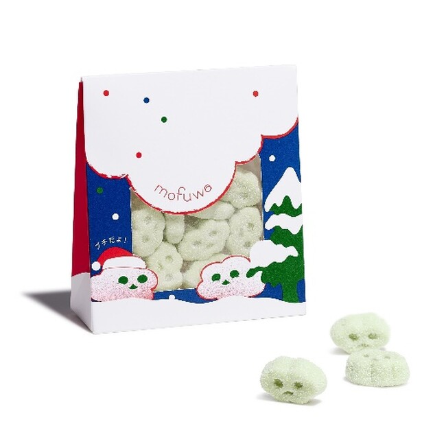 ”もふふわ食感”が楽しめる雲形の「mofuwa」を一口サイズに小さくした、何とも言えない癒し系の表情が楽しめるマシュマロ。クリスマス限定のメロンソーダ味で、ついつい食べ続けたくなるおいしさです。サンタの帽子を被ったmofuwaが描かれたパッケージの窓から、かわいらしいマシュマロがのぞきます。手に取りやすいサイズ感でお手頃価格なので、普段お世話になっている家族や友人、職場へのギフトや出張のお供などにもぴったりな商品です。