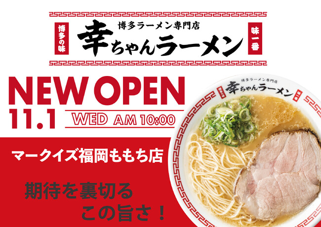株式会社ウインズジャパンホールディングス(所在地:福岡県福岡市博多区、代表取締役社長:吉村幸助)は、2023年11月1日(水) 10:00に博多ラーメン専門店『幸ちゃんラーメン マークイズ福岡ももち店』を福岡県福岡市地行浜にある三菱地所運営の商業施設 マークイズ福岡ももち 3Fのフードコート内に出店いたします。元祖泡系 『博多一幸舎』がプロデュースする『幸ちゃんラーメン』の10店舗目です。