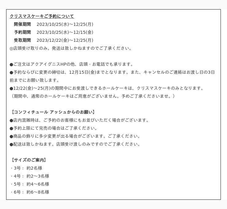 ぜひコンフィチュール アッシュのケーキで素敵なクリスマスをお過ごしください。