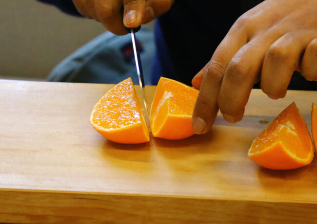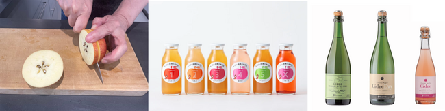 会場で「りんご狩り」したりんごは、その場で食べやすいように無料でカットいたします。わたしたちがおすすめするのは「皮のまま輪切り」です。うすく輪切りにしたりんごは、スナック感覚でシャキシャキと種のまわりぎりぎりまで食べられます。「みかん狩り」したみかんも、どうぞお召し上がりください。「すっぱい林檎の専門店。」の「すっぱいりんごジュース」や、毎年大人気の「サンクゼール」のシードルも販売します。