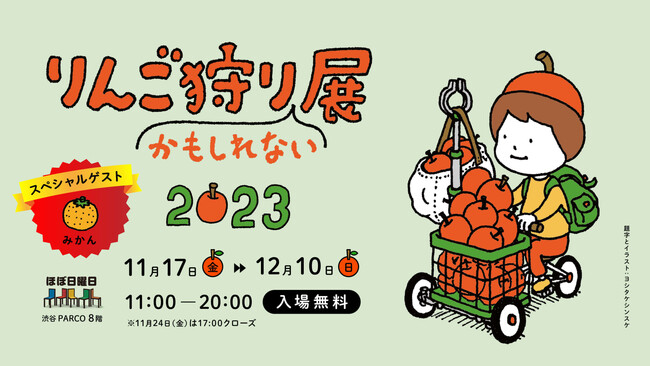 実りの秋、りんごの季節です。渋谷PARCO8Fの「ほぼ日曜日」で、2021年より毎年開催され、好評をいただいている「りんご狩りかもしれない展」を、今年も開催します。岩手県盛岡市にある「サンファーム」から、多品種のりんごが届くのはもちろん、今回はスペシャルゲストの「みかん」も登場!愛媛県から、おいしいみかんが届きます。「ほぼ日曜日」の会場内に立つ木に、たわわに実ったりんごとみかんを自分の手でもぎ取って、「りんご狩りかもしれない」体験をおたのしみください!飲みくらべがたのしいりんごジュースや、昨年も人気だったシードルもご用意しています。りんごの香りあふれる会場へぜひあそびにきてくださいね。詳細は https://www.1101.com/hobonichiyobi/exhibition/5990.html にてご覧いただけます。