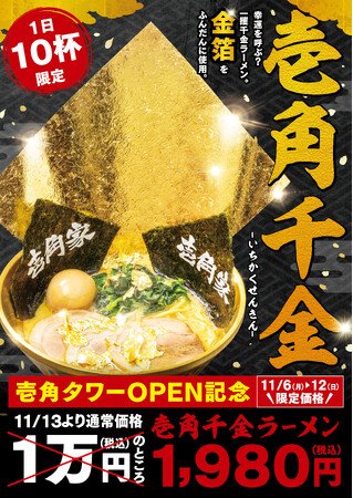 株式会社ガーデン(本社:東京都新宿区 代表取締役社長:川島賢 以下「当社」)が運営する「壱角家」は、日本を代表する華やかでエンターテイメント施設が多く集まる新宿エリアでも、新宿駅東口から徒歩2分、靖国通り歌舞伎町交差点と駅近な立地に、2023年9月7日(木)に「壱角家 新宿靖国通店」壱角タワーをオープンいたしました。それを記念して、“金”の器に“金”の海苔と“金箔”がのった“金”づくしの豪華でインパクト抜群な「壱角千金ラーメン」を、2023年11月6日(月)より11月27日(月)まで1日10食限定で販売いたします。 また、2023年11月6日(月)から11月13日(月)は、「壱角家 新宿靖国通店」壱角タワーオープンキャンペーン価格として、通常10,000円(税込)のところを1,980円(税込)で販売いたします。