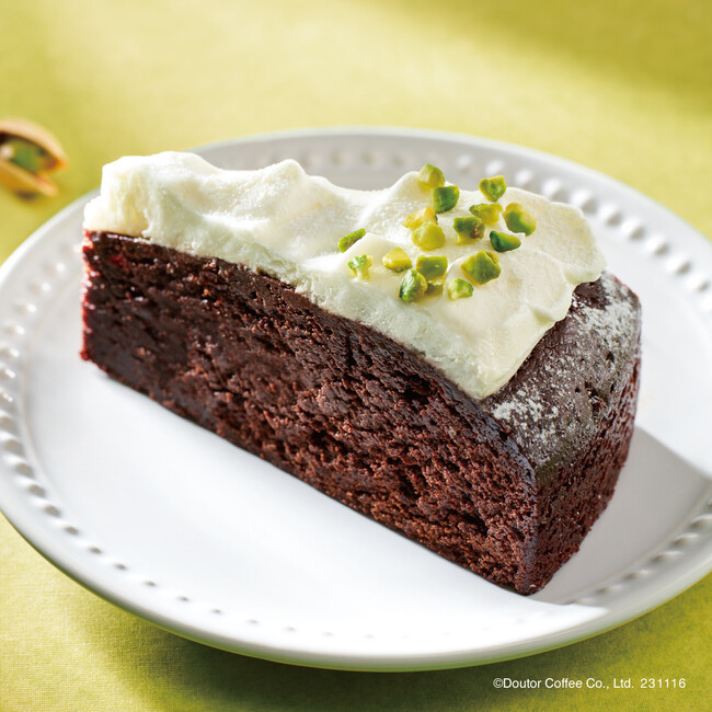 ベルギー産と国産のクーベルチュールチョコレートを使用した、濃厚な味わいのガトーショコラです。国産クーベルチュールには、フルーティーな酸味のドミニカ共和国産カカオと、しっかりとしたボディ感を持つガーナ産カカオをブレンド。甘苦いアーモンドのような香りのアマレットと芳醇な香りのブランデーが、奥深い香りと味わいを演出しています。天面にはホイップクリームとピスタチオをトッピングして仕上げています。
