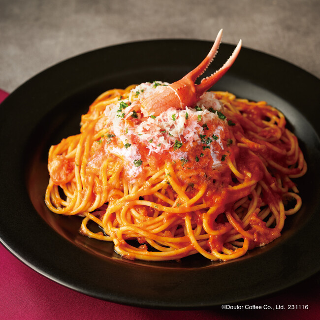 昨年好評いただいた、高級食材の「蟹」を使用したトマトクリームパスタが再登場。ソースに蟹みそエキスやトマトペースト、生クリームを使用しコクと深みのあるソースに仕立てました。また、具材には蟹のほぐし身を、トッピングには蟹のほぐし身と蟹の爪をチョイス。蟹好きにはたまらない贅沢パスタです。