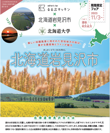 『るるぶキッチン』は、「地域」や「食材」を変えながら、その土地の産品を活かしたメニューを開発する「特集フェアメニュー」が特徴です。今回は、北海道の空知地方で札幌や新千歳空港から車で1時間圏内に位置し、豊かな農産物とワインが魅力の岩見沢市をフォーカスし、オリジナルおつまみメニューやドリンクなど20品以上を提供いたします。また、産学連携の一環として、北海道内の企業や特産品とタイアップして商品開発を行っている北海道大学の「北大ブランド」商品や「フードロス削減コンソーシアム」関連商品の提供、販売も行います。