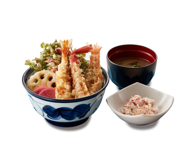 旬の贅沢な素材をのっけた「ごちそうシリーズ」。旨みが詰まった大きな「北海道産肉厚帆立」、冬の定番「ずわい蟹」、ふんわりとし た「活〆穴子」、人気の「海老」の天ぷらと、箸休めにたれとの相性が抜群な青じそ風味の「広島菜漬け」を添えました。冬ならで はの海の幸を堪能できる豪華な天丼です。