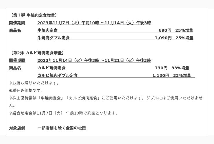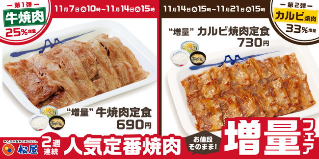 このたび松屋フーズ(本社:東京都武蔵野市、代表取締役社長:瓦葺一利)では、牛めし・カレー・定食・その他丼の「松屋」におきまして、2023年11月7日(火)より1週間「牛焼肉定食」、2023年11月14日(火)より1週間「カルビ焼肉定食」の増量フェアを開催いたします。