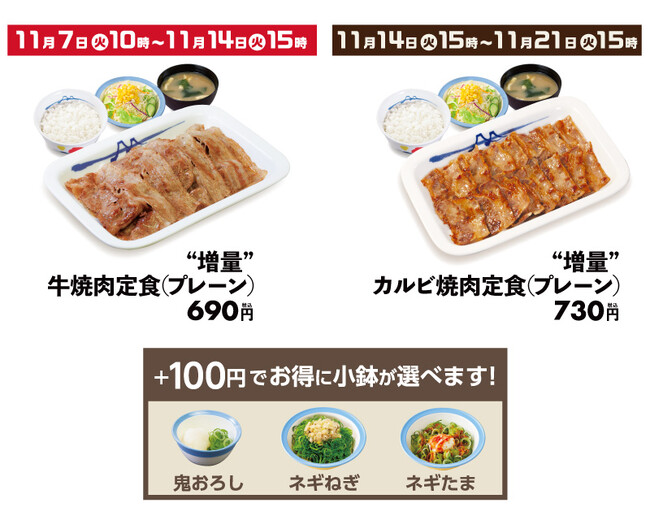 松屋定番の定食、「牛焼肉定食」「カルビ焼肉定食」のお肉が期間限定で、お値段そのままに増量します。「牛焼肉定食」は創業当初より松屋の食卓に並ぶ大人気のロングセラーで、松屋特製の「ポン酢だれ」「バーベキューだれ」「焼肉のタレ甘口」の3種類のお好みのタレで味変しながらお召し上がりいただく方も多い定番の定食。「カルビ焼肉定食」は、1990年代に登場し、長年多くのお客様から愛され続けているこだわりの逸品で、柔らかくジューシーなお肉の旨味と甘じょっぱいタレが相性抜群のメニュー。こちらも味変が人気で、大根おろしでさっぱり味わえる「鬼おろし」、たっぷりの青ネギとコチュジャンベースの特製ダレにとろとろ半熟玉子がたまらない「ネギたま」、ネギ好きにはたまらないネギダレと青ネギの「ネギねぎ」の小鉢もプラス100円でご用意しております。それぞれ1週間ずつ、お値段そのままでお肉の量が増量します。この機会にぜひ、ご賞味ください。