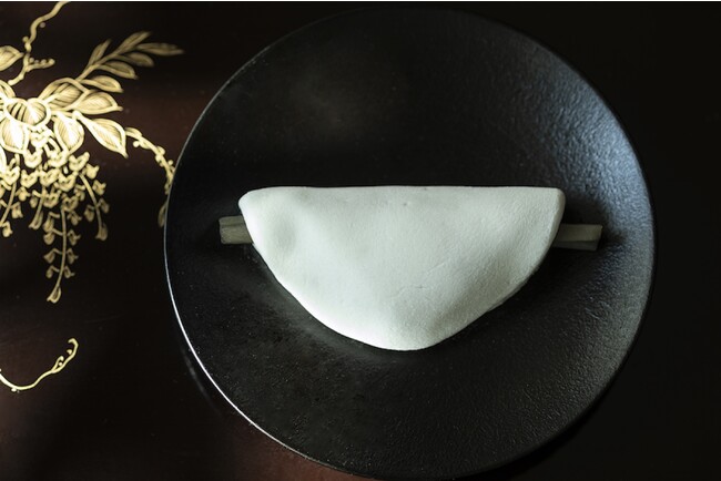 江戸時代の芝居茶屋では、酒肴や水菓子などが次々に供されていました。本プログラムでは、そうした芝居茶屋のおもてなしに倣い、星のや総料理長・浜田統之(のりゆき)監修の酒肴とワインを提供します。「宴遊(えんゆう)日記別録」の記述によると、江戸時代、芝居鑑賞後には夜餉(よるげ)として蕎麦が出されていました。そこから着想を得て考えたのが、蕎麦に見立てたモンブランとデザートワインのペアリングです。江戸漆器の蒸篭(せいろ)で提供するモンブランには、和栗のペーストを使用し、中にはジェノワーズ(スポンジ生地)、クレームシャンティ、栗の甘露煮を忍ばせています。さらに、豆皿に添えて提供するのは、蕎麦の薬味に見立てた「七味のメレンゲ」、「生姜のパート・ド・フリュイ*3」、「山葵のプラリーヌ*4」です。実際の蕎麦の薬味のように、モンブランと一緒に食べることで味に変化が生まれます。これらとペアリングさせるのは、甘味とシャルドネの酸味のバランスが良い白ワインです。樽で熟成された、ほのかな甘く香ばしい香りが特徴で、モンブランの味わいに深みを与えます。