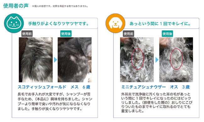 モニターアンケートでは、「毛艶が良くなった」「臭いが軽減した」「お尻周りのケアが楽になった」などの声があり、長毛種の老犬では、食事後の口周りを拭くのに重宝します」と言った私たちでは気づかなかった声もいただきました。