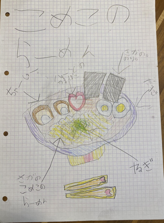 パパが最近、小麦粉アレルギーになって、小麦粉を使った料理を食べられなくなりました。一緒にラーメンを食べに行ったり、うどんを食べに行ったりすることがとても減りました。パパが、「とんこつラーメン食べたいなあ」とよく言います。ママが米粉を使ってパンを焼いたり、料理するのを見て、米粉のラーメンもあったらパパが食べれるのになあと思いました。くふうしたところは、麺を米粉にしたことと、佐賀のおいしい海苔をハートにしたことです。味が変わる秘密のハートと星もトッピングでのっています。大好きなパパとラーメンを食べたいです!!パパが食べてくれるのは一番楽しみだけど、小麦粉アレルギーがある人にも食べてほしいです。自分が考えたメニューが本当にラーメンになったのがとっても嬉しいです。