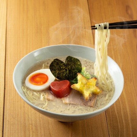 また、かえしやチャーシューの仕込みに使用する醤油も、原材料に小麦を含まないものを使用しています。トッピングはとんこつラーメンらしく、チャーシュー、ネギ、海苔、半熟塩玉子に、ハート型の有明のりをのせました。さらに、応募いただいたイラストにもハートのトッピングがあったので、ハート型と星型のトッピングを加えました。ハート型のトッピングはトマトペーストをゼラチンで固めたもので、スープの温度で徐々に溶けるため「味変アイテム」にもなります。星形のトッピングは、ふうかさんの好きなジャガイモを使用し、マッシュポテトを星形に形成したものです。何度も試作を重ねて完成した一風堂初挑戦の「こめこのらーめん」を、自慢のとんこつスープや見た目も可愛らしい特製トッピングと一緒に家族みんなでお楽しみいただけたら幸いです。