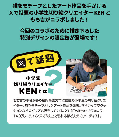 猫をモチーフとしたアート作品を手がけるXで話題の直方市内在住の小学生切り絵クリエイターKENともち吉がコラボした限定返礼品の取り扱いを2023年11月1日(水)から開始します。【もちNEKOKAN URL】https://item.rakuten.co.jp/f402044-nogatashi/007-3036/