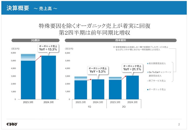 売上高は、前期に終了したサービス・施策等の特殊要因の影響を除くオーガニック売上が、2Q累計(4~9月)で前年同期比13.3%増、2Q(7~9月)で前年同期比21.1%増と大きく伸長しました。