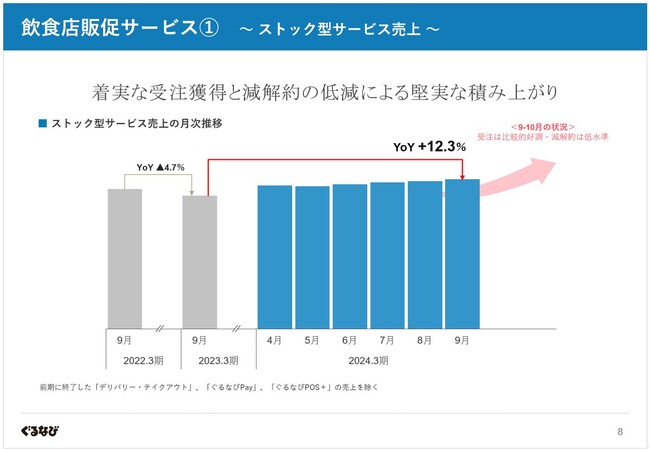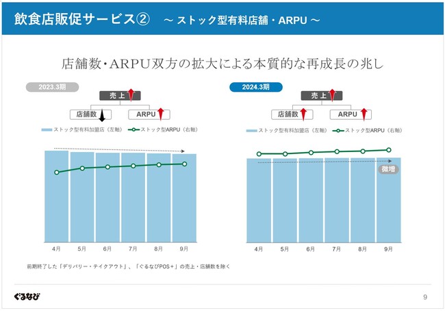 3月にマスク着用ルールが緩和され、5月にはコロナの感染症法上の分類が5類へ移行したことをきっかけに飲酒を伴う外食支出が回復し、飲食店の販促に対する意識は改善傾向にあることを背景に、より集客効果の高いの加盟プランへの切り替えや追加の商品利用が活発化し、1店舗あたりの契約高(以下「ARPU」といいます。)が上昇したのに加え、減少が続いていたストック型有料加盟店舗数が5月に底打ちし緩やかながらも増加基調に転じ、ARPU・店舗数双方の拡大による本質的な再成長の兆しが見られます。