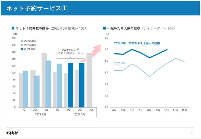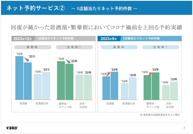 またネット予約件数については、2023年に入りコロナ禍前の2020年3月期を上回る水準で推移しており、特にコロナ禍の影響からの回復が鈍かった居酒屋・繁華街においても1店舗当たりのネット予約件数がコロナ禍前を上回る実績へと回復していることから、コロナが5類に移行して初めて迎える今年の年末は本格的な忘年会需要の回復が期待されます。
