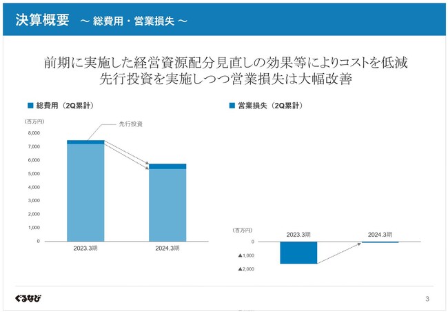 そして、費用については注力サービスの絞り込みや高いコスト意識の浸透により、未来に向けた先行投資を継続・強化しつつも低減。その結果、営業損失は前年同期より大幅に縮小し着地しました。