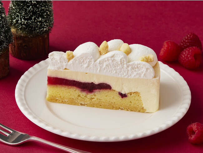 アーモンドクリームを流して焼き上げたタルト生地にラズベリージュレ、ホワイトチョコレートムース、ホイップクリームと、食感のアクセントになるクッキーをトッピングしました。 最後に粉雪のイメージした粉砂糖を振りかけて冬らしく仕上げました。