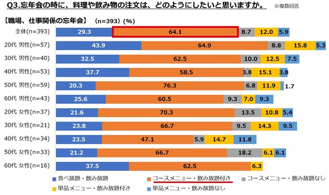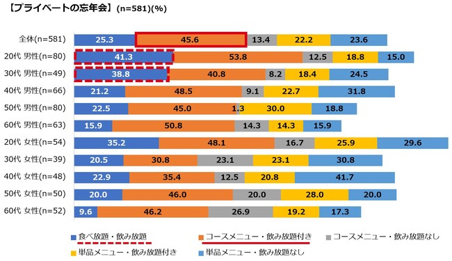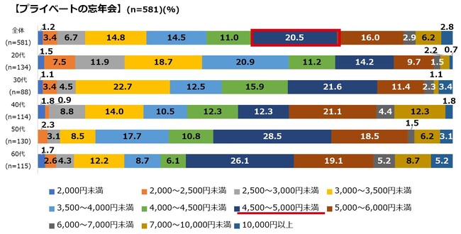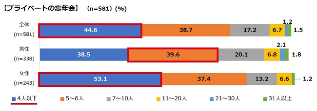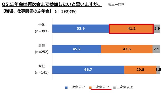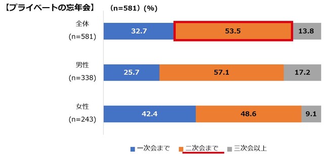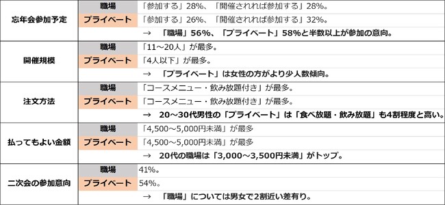 また、コロナ禍では二次会需要が低下しましたが、今回は「二次会」の参加意向も、プライベートで5割を超える結果となりました。職場・仕事関係でも4割となりましたので、忘年会ならではの開放感も相まって、この冬は遅い時間も繁華街に賑わいが絶えないかもしれません。