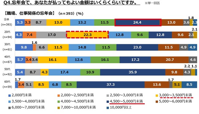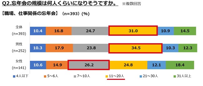 職場、仕事関係の忘年会に関する結果を見ると、「11~20人」の大人数での忘年会参加意向が最多となりました。内容としては「コースメニュー・飲み放題付き」の希望が多い中、価格は「4,500円~5,000円未満」の希望が最多。