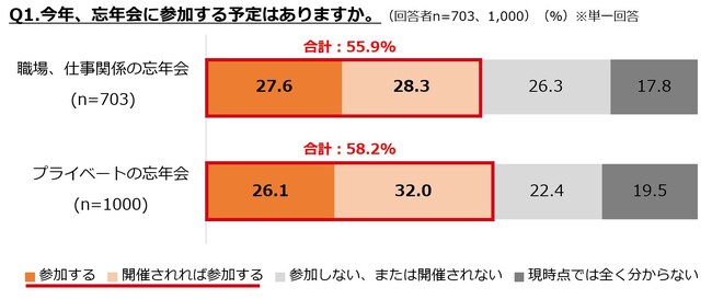 行動制限のないこの冬、職場やプライベートでの忘年会に参加する機会が増えるという方も多いのではないでしょうか?すでに3割近くの方が予定を入れており、開催されれば参加する=参加希望の方を合わせると、半数以上の方が「忘年会」参加予定・希望となりました。