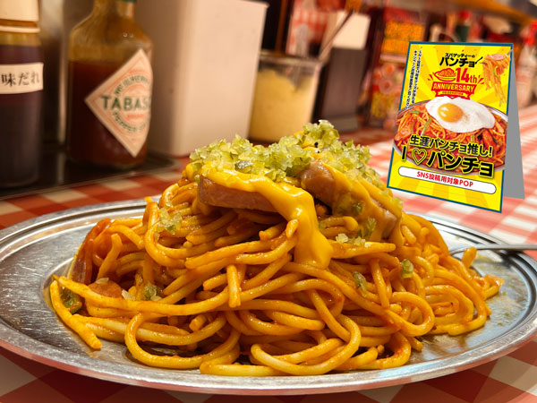 ▼創業祭テーブルPOPは黄色のナポリタンデザインが目印。SNS写真投稿[#パンチョ14周年]をたくさんお待ちしています!(※写真・POPはサンプルです)