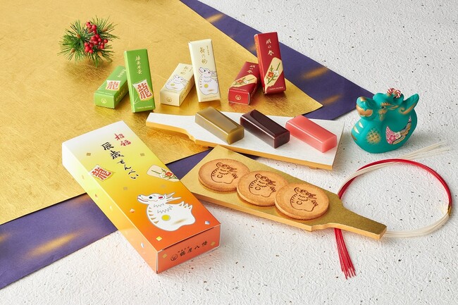 生菓子のようなやわらかさとみずみずしさが特徴的な<鶴屋八幡>の羊羹のおいしさそのまま食べきりサイズに。小豆を夜に咲き誇る梅になぞらえた粒あん「夜乃梅【辰】」、紅色の練羊羹「明の春【梅】」、香り高い抹茶を煉羊羹に加えた「抹茶羊羹【凧】」の3種類や、「辰」の焼き印をあしらった風味豊かな玉子せんべい。年末年始のご利用にふさわしい迎春限定の意匠でご用意しました。