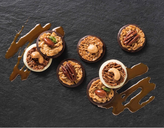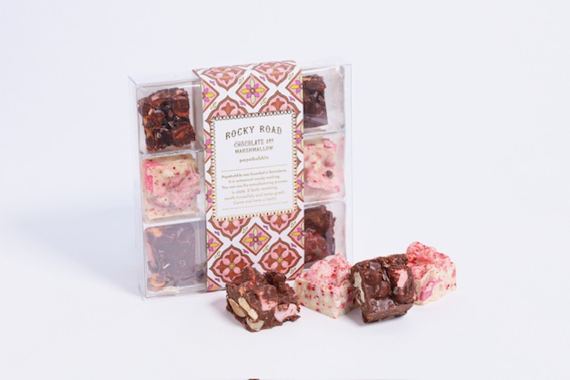 マシュマロ・チョコレート・ナッツを混ぜ合わせ、そのゴツゴツした様子から岩場の道にたとえられた、海外では人気の伝統菓子「ロッキーロード」をパパブブレ風に。2種類のナッツとオレンジ・イチゴのマシュマロを合わせた『ロッキーロード ミルク』、ホワイトベースのチョコレートの中に、酸味を効かせたラズベリーとカシスのマシュマロとライスパフが入った『ロッキーロード イチゴ』。どちらも楽しめる9個入りです。