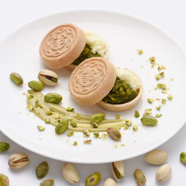 滋賀県産の糯米「羽二重餅」を使った最中皮に餡と自家製クリームをお好みでサンドしていただく「あんぽーね」に、毎年人気のピスタチオが登場。アーモンドペーストとヘーゼルナッツオイルが奥行きのあるコクを生み出し、刻んだピスタチオが食感のアクセントに。自家製のマスカルポーネチーズクリームとの相性も抜群です。