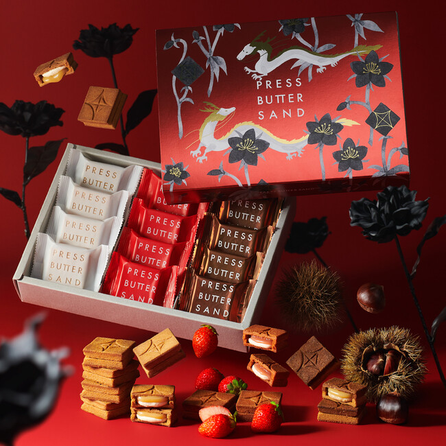 新春を彩る華やかなパッケージデザイン。2024年の干支であるつがいの龍が、バターサンドの花の間をゆったりと泳いで散歩しています。中には福岡県産の「あまおう苺」を贅沢に使用した〈あまおう苺〉、マロングラッセを加えた栗の風味が濃厚な〈栗〉、クリームとキャラメルの2層を挟み込んだ代表商品のバターサンドの3種を詰合せました。紅白とブロンズの個包装が煌めく、年末年始のご挨拶にぴったりの詰合せです。