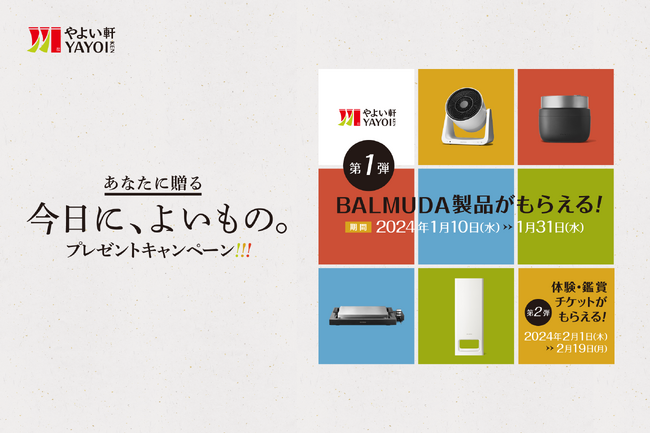 株式会社プレナスは、定食レストラン「やよい軒」を、日本国内にて2023年11月末現在360店舗展開しております。このたび日本国内の「やよい軒」では、「やよい軒」ホームページ・Instagram・公式アプリ・X(Twitter)において、新タグライン『Precious to me. 今日に、よいもの。』公開を記念して、“あなたに贈る 『今日に、よいもの。』プレゼントキャンペーン”を実施いたします。新タグライン『Precious to me. 今日に、よいもの。』に込められたブランド価値『REAL』、『LIVE』、『CONNECT』、『MODERN』を感じていただけるプレゼントをご用意いたしました。キャンペーンは第1弾・第2弾を開催予定です。第1弾は1月10日(水)より、洗練されたデザインとシンプルな機能で人気のBALMUDA製品をご用意しております。ぜひ、この機会にキャンペーンにご参加ください。