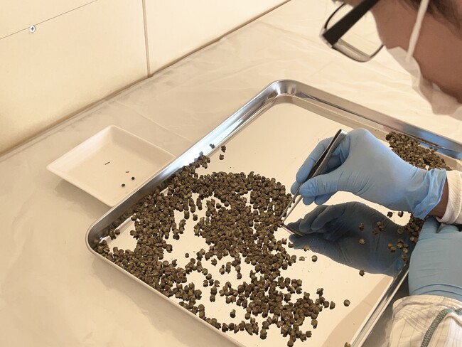 生産者である篠畑氏が、「緑のダイヤ」とも呼ばれるぶどう山椒を、大事に心を込めて生産しています。選別作業については、写真のようにピンセットで果肉部分以外の種や枝を選り分けます。