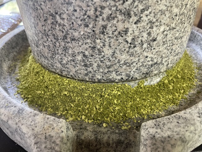 粉挽き作業については、摩擦熱による風味の飛散を出来るだけ抑えるため、石臼を用いて超低速で挽いていきます。なんと1時間で200g程度しか製粉できません(粉タイプのみ)。