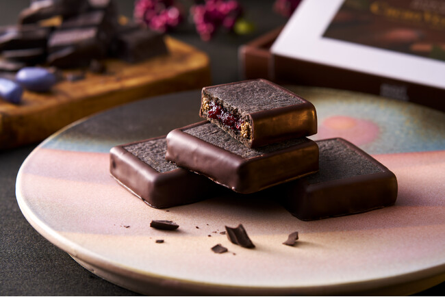 4つのハーモニーの一つ、縁取りチョコに、ほろ苦いビターチョコを選んでジャム、バタークリーム、ク