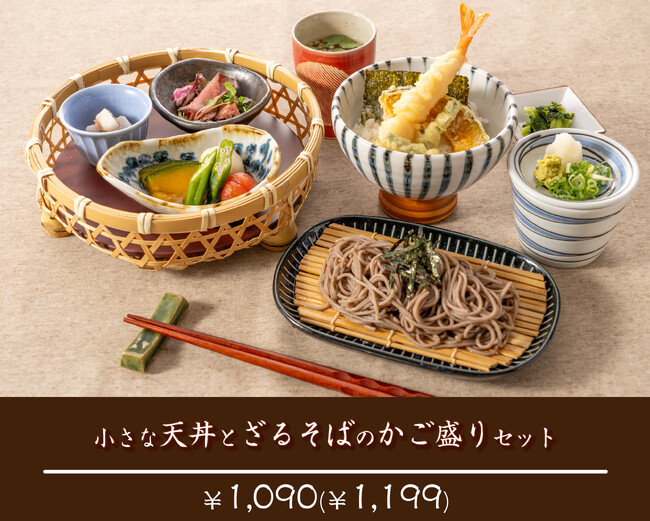 ・小さな天丼とざるそばのかご盛りセット 1,090円(税込み1,199円)