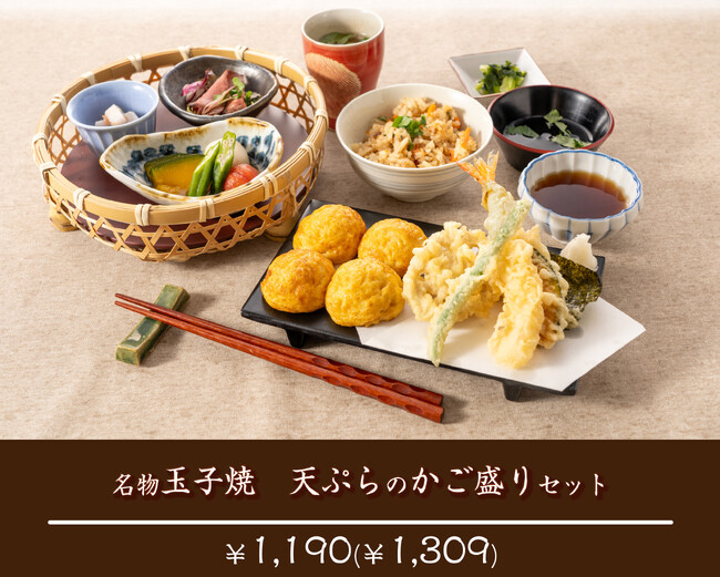 ●名物玉子焼と天ぷらのかご盛りセット 1,190円(税込み1,309円)