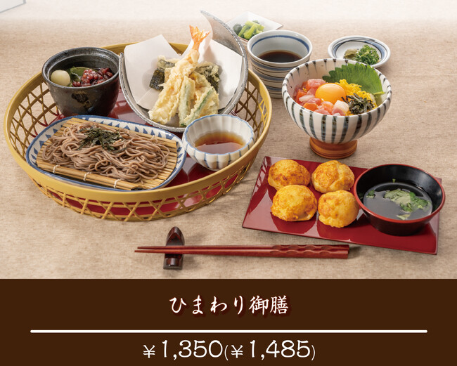 ひまわりの”特製お出汁”を使用した、名物玉子焼(明石焼)と季節の天ぷら、小さな海鮮丼、お出汁を味わうおうどん(そば)、お抹茶のゼリー等、いろいろなお料理を少しずつ組み合わせ、ひまわりの「美味しい」を一つのお膳で楽しむことができるメニューです。彩り豊かな海鮮丼を特製醤油でお召し上がりいただける様にご用意しました。