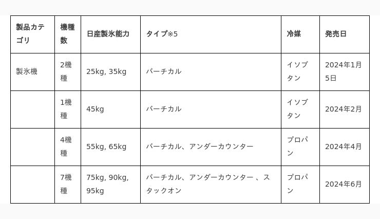 ホシザキは、本年2月、2024年末までに国内のすべて※2の業務用冷凍冷蔵庫を自然冷媒に変更することを表明し、ラインナップ拡充を進めています。製氷機においても、特注機だけでなく、当社として国内で初めて標準モデルに自然冷媒を採用します。2024年1月5日より順次、販売を開始し、6月までに14機種を発売します。