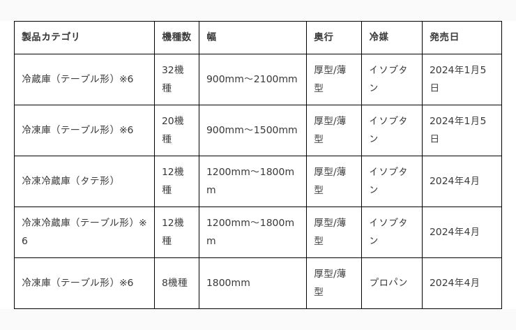 業務用冷凍冷蔵庫では、本年5月、普及価格帯のタテ形(縦型)の冷蔵庫・冷凍庫68機種を発売し、特に環境への取り組みを推進するお客様での採用が続いています。テーブル形の要望も多いことから、当初計画より早い2024年1月5日より、テーブル形の冷蔵庫32機種、冷凍庫20機種、合計52機種を発売します。2024年4月には、タテ形12機種およびテーブル形6機種の冷凍冷蔵庫、テーブル形2機種の冷凍庫、合計20機種の発売も予定しています。