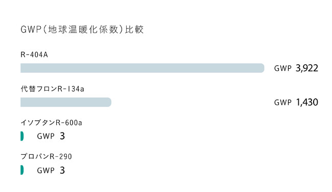 ※1 自然冷媒とは、自然界にもともと存在する物質を使って冷凍用や空調用の冷媒に使用できる物質です。オゾン層破壊係数(ODP、Ozone Depletion Potential)がゼロ、かつ、地球温暖化係数 (GWP、Global Warming Potential) が非常に低い、地球に優しい冷媒のことです。GWPは、二酸化炭素(CO2)を1とした場合に、その温室効果ガスの温暖化の大きさを表した数値です。イソブタン、プロパンのGWPは、国連環境計画(UNEP)の「OzonAction Kigali Fact Sheet 3」(2017年公開)では3、世界気象機関(WMO)(国連の専門機関)の「Scientific Assessment of Ozone Depletion: 2022」(2022年10月発行)では「<<1」(1より非常に小さい)となっています。