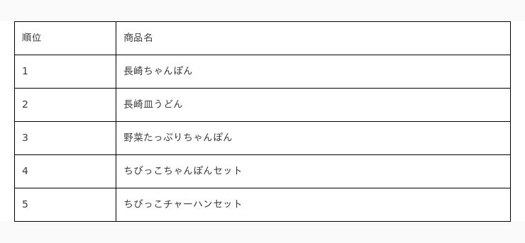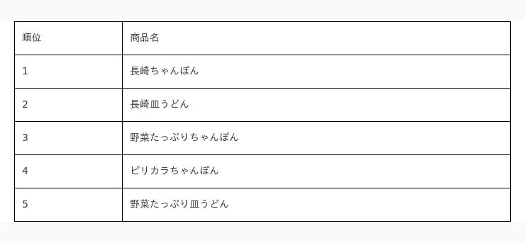 また、ファミリーでは4位に「ちびっこちゃんぽんセット」、5位に「ちびっこチャーハンセット」がランクインしました。ちびっこメニューにはジュースとデザートが付いており、ファミリーならではの子供向けメニューが好まれている結果となりました。