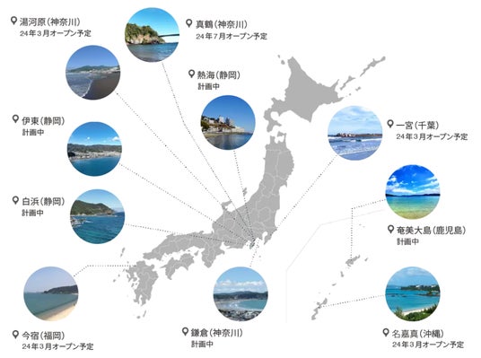 一宮、今宿、名嘉真、湯河原(紹介ページ制作中)の4拠点からUMITO LIFEはスタートします。今後は鎌倉、熱海、伊豆白浜、伊東など、続々と新しい拠点が増えていきます。