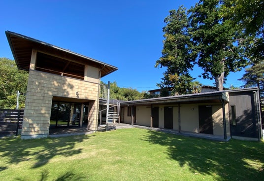 湯河原の景色を一望できる広々としたテラス付きの美しい芝庭。バーベキューができる設備があるので、地元の新鮮な食材を購入して大自然の中でお楽しみいただけます。