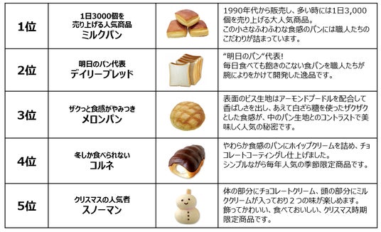 1位2位は不動のミルクパン、デイリーブレッドでしたが、寒い冬のこの時期にしか食べられない毎年人気の「コルネ」と、12月1カ月間限定販売で、見た目がかわいいと人気の「スノーマン」がランクインしました。
