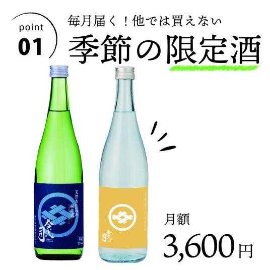 ここだけでしか味わえない限定酒と、季節に合わせたおすすめ酒の2本をセットにして毎月お届けする『今代司の日本酒定期便』。お試しにぴったりの3か月型と、面倒な継続手続きが要らない通年型の2種類をご用意しています。